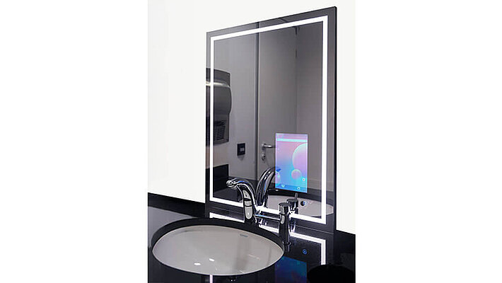 Das M2G Spiegeldisplay ist eine elegante und moderne Lösung für die Vernetzung in Badezimmern, Smart-Home-Umgebungen oder im Hotelbereich.